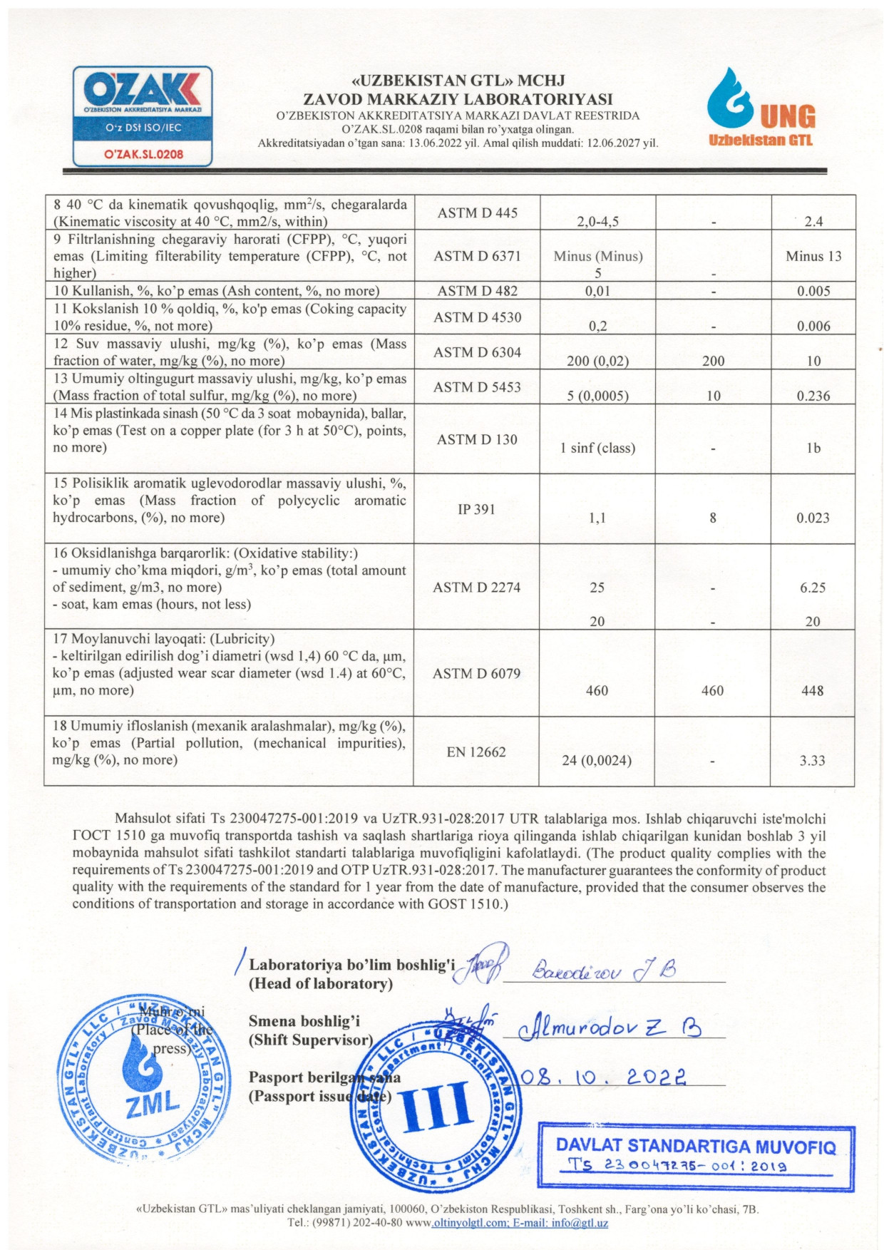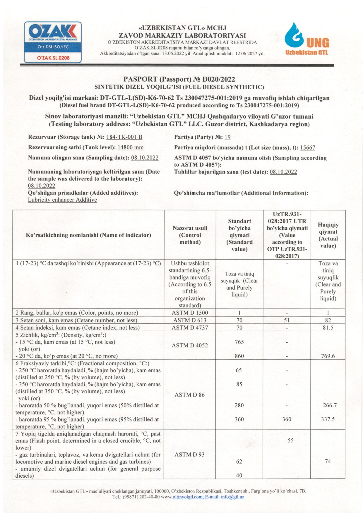 In the modern world, diesel on merit takes one of a lead positions in the industry and synthetic diesel (hereinafter referred to as LPGSP fuel) produced by Uzbekneftegaz LPGSP Plant is also no exception. It has been widely used thanks to its advantages, among which the priority is given to high environmental and operational properties.