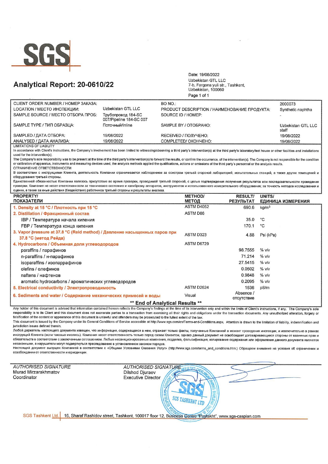 - Premium synthetic naphtha with the paraffin content of up to 98% and ultra-low sulfur content